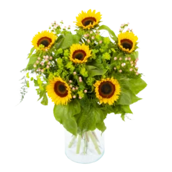 De practhige combinatie tussen zonnebloemen en groen geeft boeket zonnestraal een gezellige en zomerse uitstraling. Dit zonnebloemen boeket creëert meteen een prachtige sfeer in huis. Bovendien geschikt voor verschillende gelegenheden. Feliciteer, bedankt of verstuur zomaar dit prachtige handgebonden boeket en verras de ontvanger! * Exclusief accessoires en vaas
